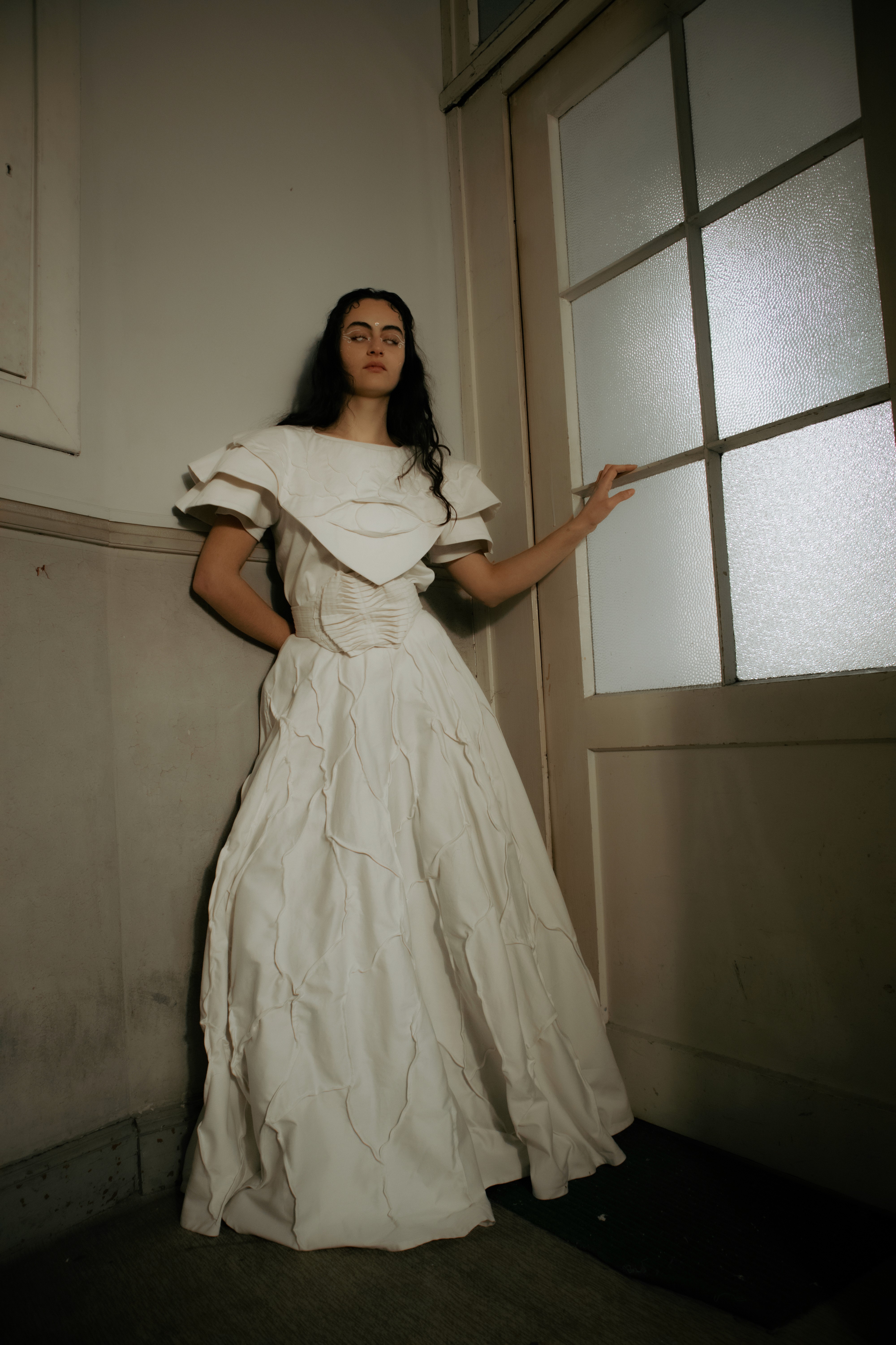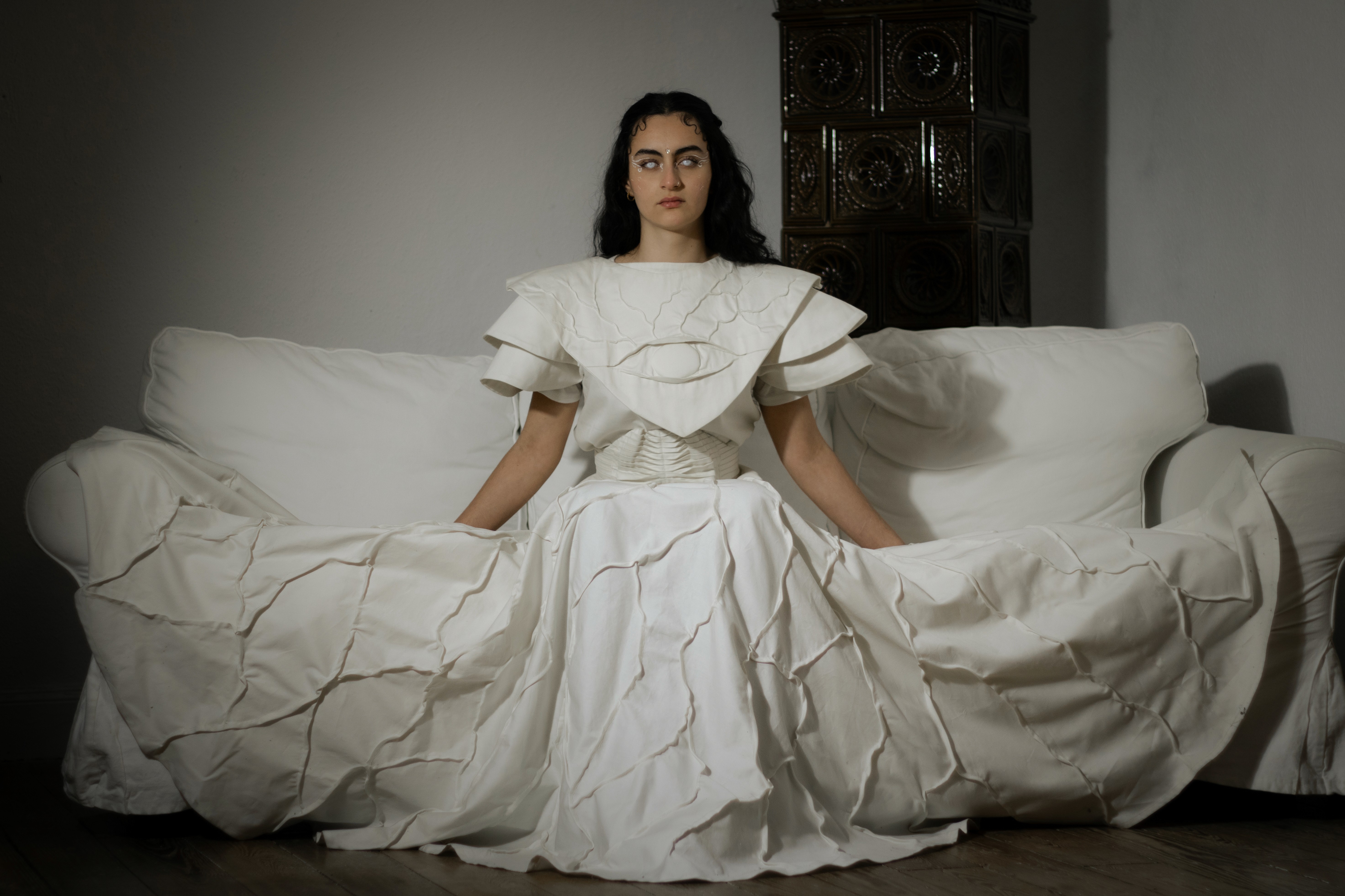 This fashion shoot was inspired by silkworms their quiet presence, delicate texture and subtle strength. The staircase setting reflflects the sheltered and enclosed environments in which silkworms thrive, away from direct light and disturbance. Through shadow, repetition and soft movement, the series explores themes of protection and transformation, translating the organic qualities of the silkworm into a minimal and atmospheric visual narrative.